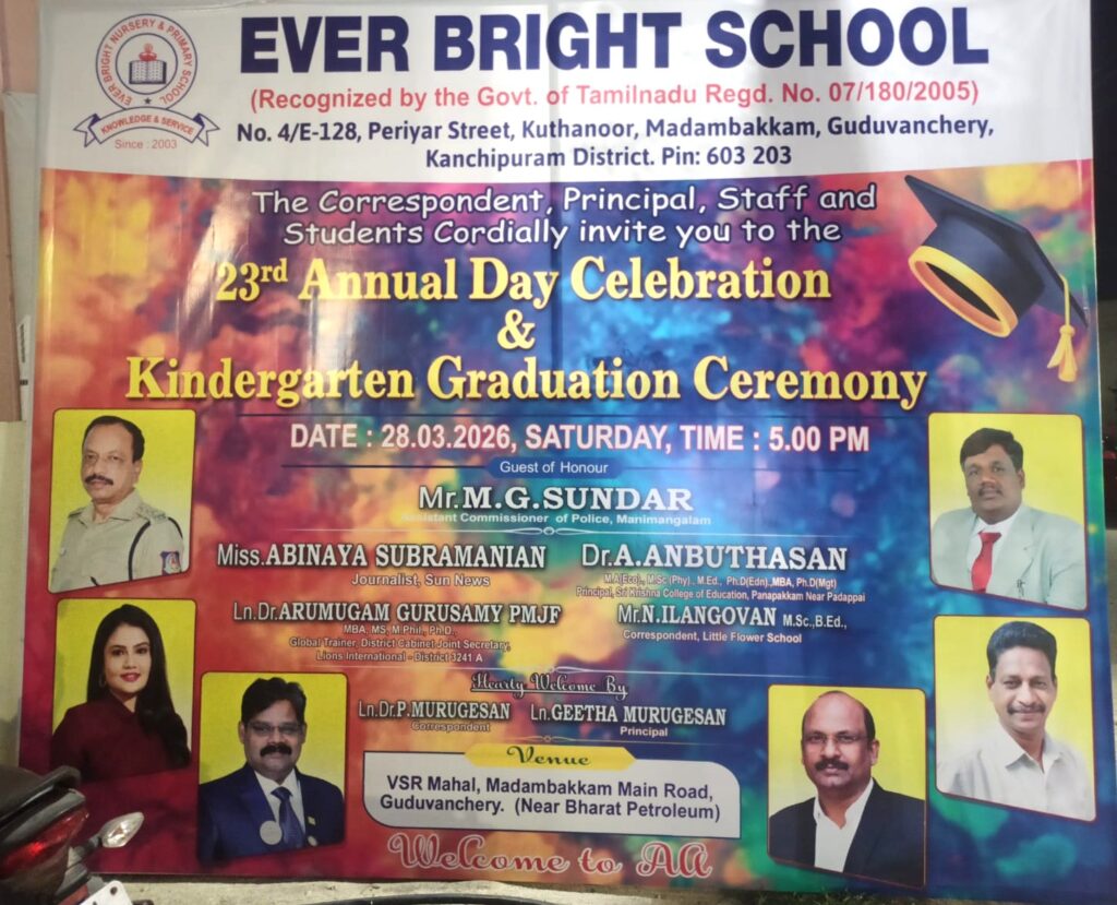 காஞ்சிபுரம் மாவட்டம், குன்றத்தூர் வட்டம், குத்தனூர்–மாடம்பாக்கம் பகுதியில் அமைந்துள்ள எவர் பிரைட் மழலையர் பள்ளியின் 23ஆம் ஆண்டு விழா கடந்த 28.03.2026 அன்று மாடம்பாக்கம் VSR மஹாலில் மிகச் சிறப்பாக நடைபெற்றது.
